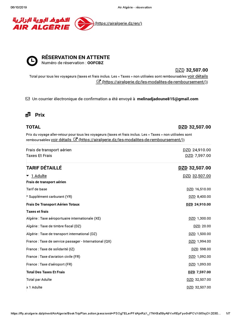 EPE/SPA AIR ALGÉRIE, Compagnie de Transport Aérien de droit Algérien, Capital social de 60.000.000.000 DZD, Numéro RC 00B0091100, Identifiant Fiscal 00001600.1190.089 : Siège social : 1 PLACE MAURICE AUDIN ALGER, ALGÉRIE, Établissement en France : RCS Paris n°775 756 729,18 avenue de l'Opéra 75001 PARIS, Tel : (Algérie) +213 2198 6363 (France) +33 1 7654 4000, Support vente.
