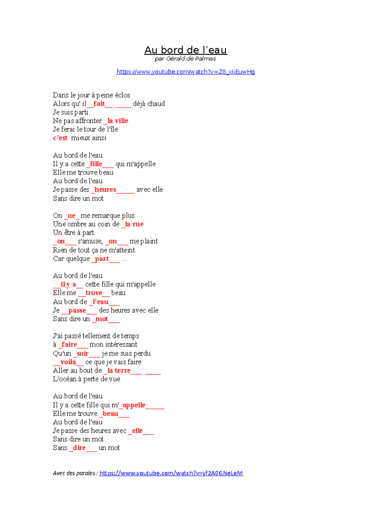 Gérald de Palmas Au bord de leau On chante Au bord de l’eau par Gérald de Palmas Studocu